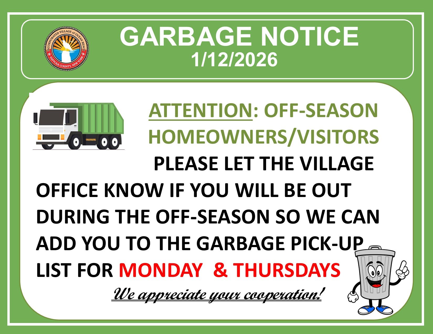 GARBAGE NOTICE - 1/12/2026